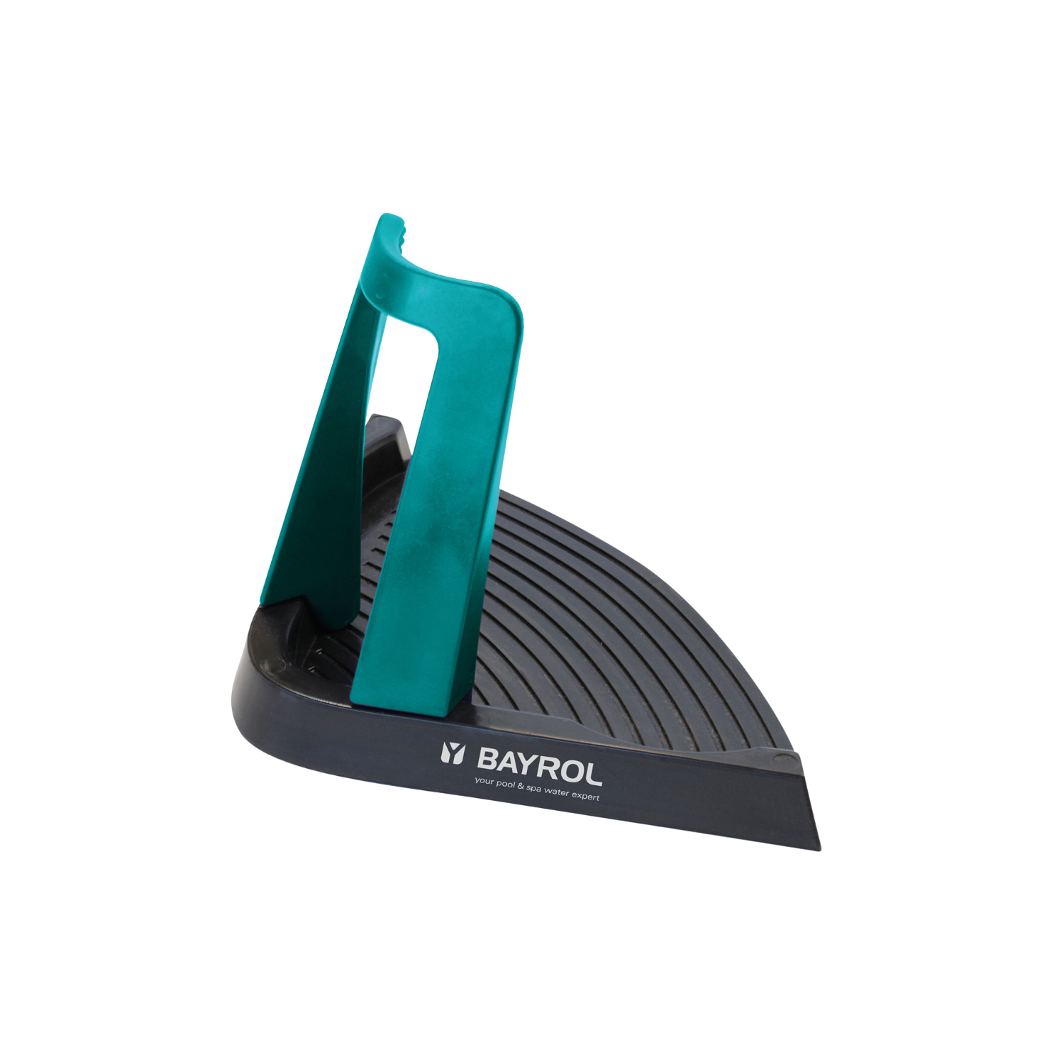 Il cuneo di trasporto è un supporto in PVC rigido con maniglia pieghevole che mette in sicurezza il trasporto dei prodotti chimici per piscina (fusti e secchi) nel bagagliaio dell’auto.