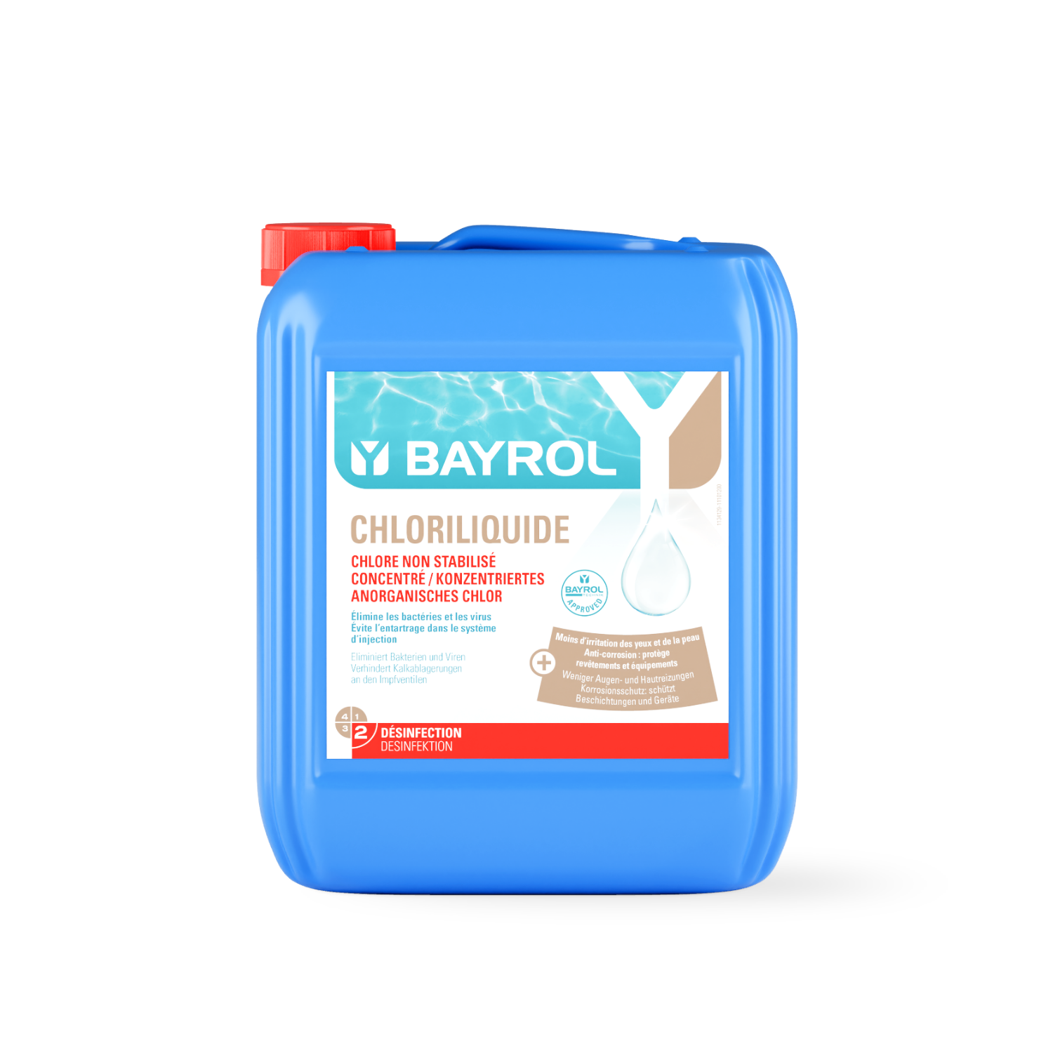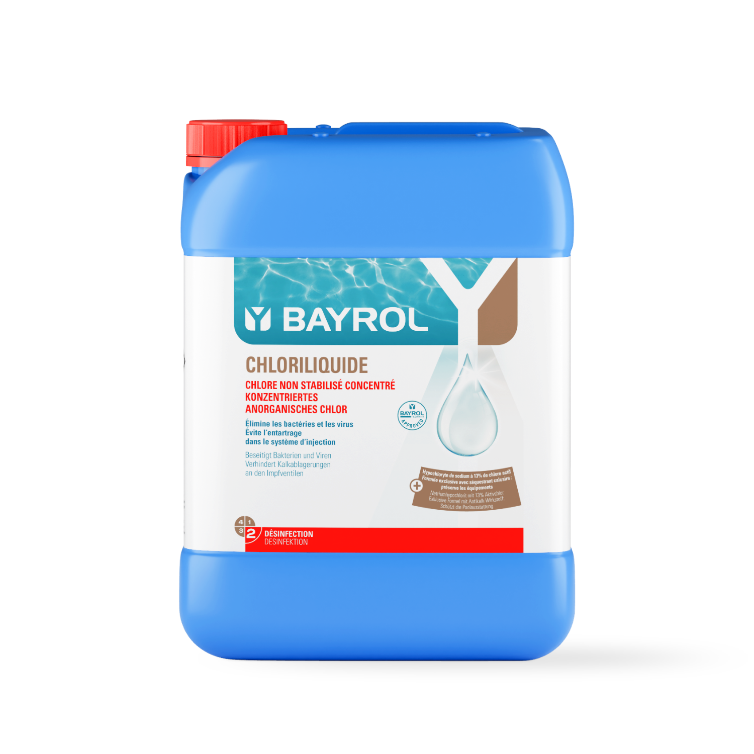 Chloriliquide è un liquido concentrato a base di cloro non stabilizzato, appositamente studiato per il trattamento continuo della piscina tramite pompa dosatrice. La formula con stabilizzatore della durezza evita la formazione di depositi calcarei.
