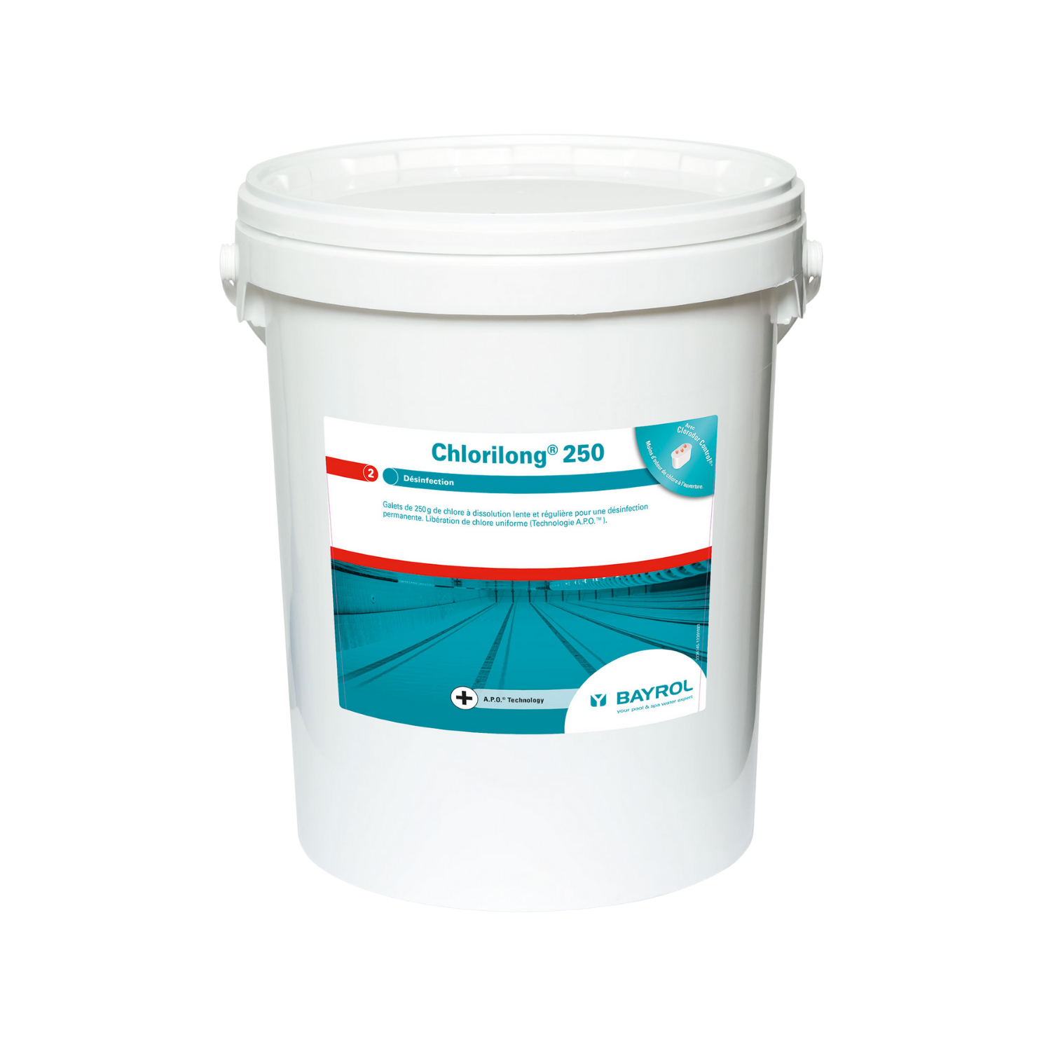 Chlorilong® 250 distrugge i batteri ed elimina le impurità. Le pastiglie di cloro da 250 g a dissoluzione lenta e regolare garantiscono una disinfezione permanente.