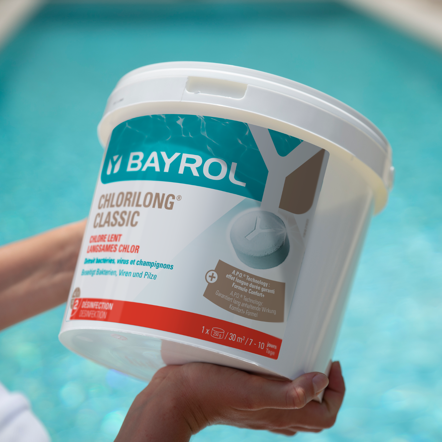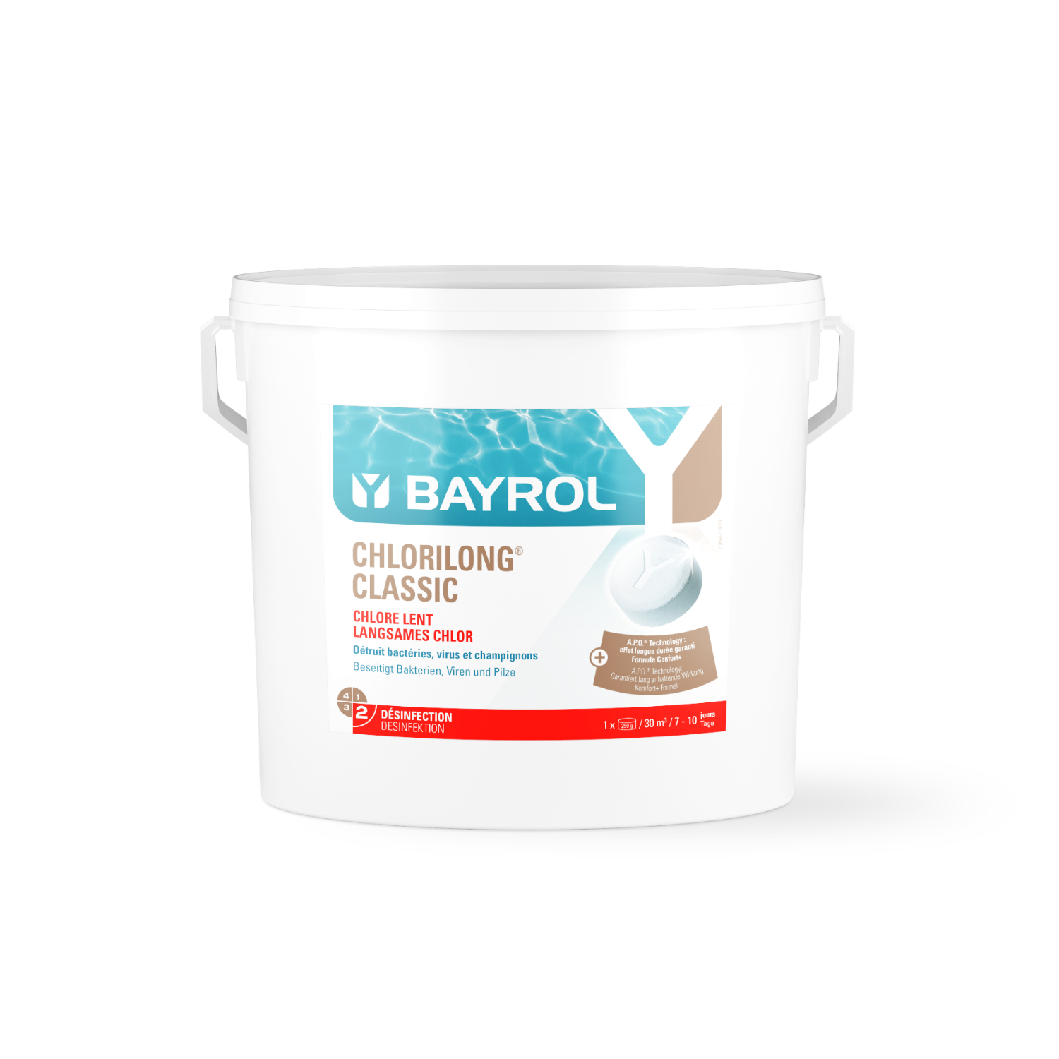 Il galet di cloro a lenta dissoluzione Chlorilong® CLASSIC elimina i batteri e rimuove le impurità. Garantisce il mantenimento di un livello costante di disinfettante nell’acqua della piscina.