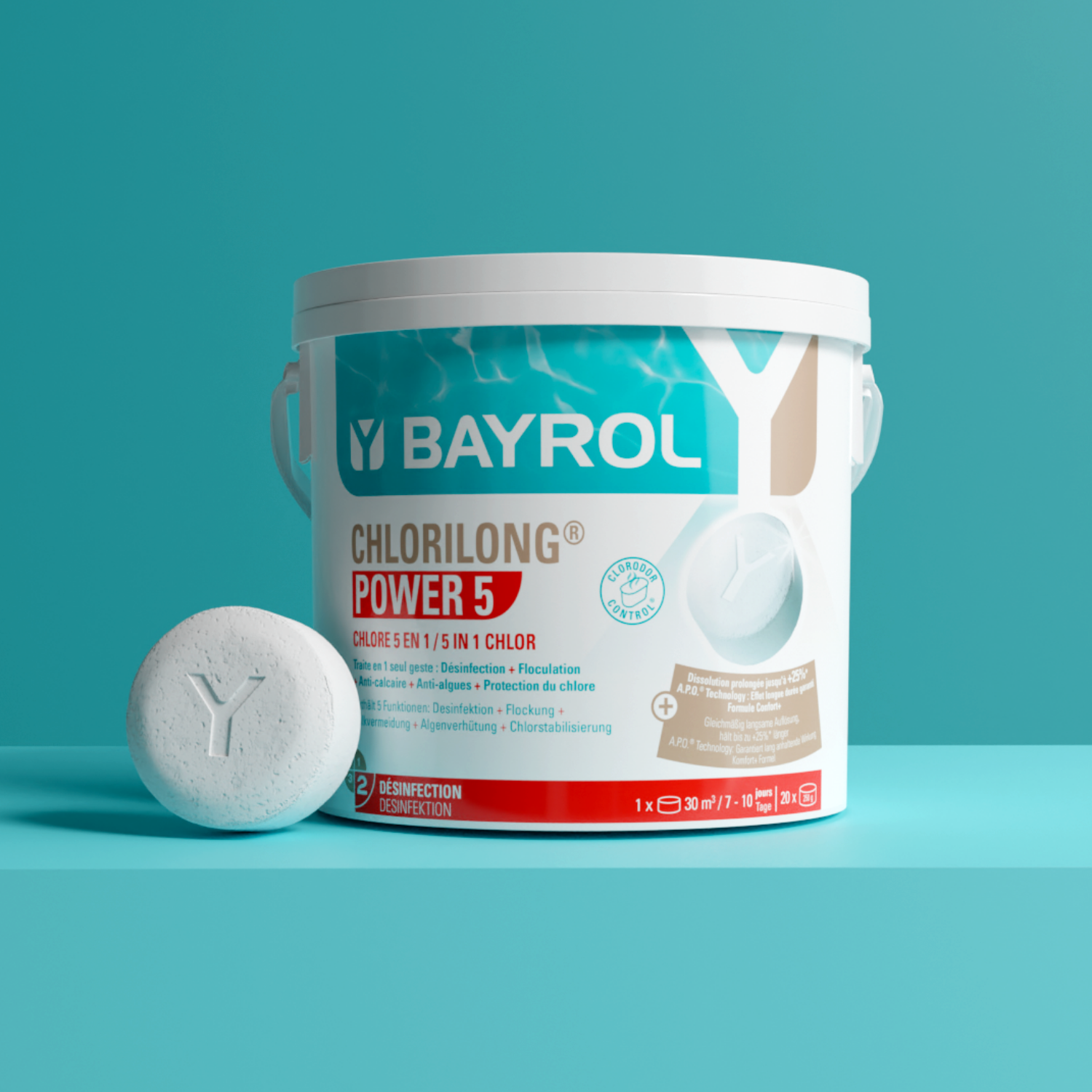 Chlorilong® POWER 5 è un galet multifunzione da 250 g, a lenta e regolare dissoluzione. Unisce l’efficacia di materie prime rigorosamente selezionate a un innovativo processo di compressione, la tecnologia A.P.O.™. Questo metodo consente di ottenere galet di qualità superiore, che si dissolvono in modo lento e molto omogeneo, rilasciando una quantità costante di cloro nell’acqua per garantire una disinfezione ottimale della piscina.