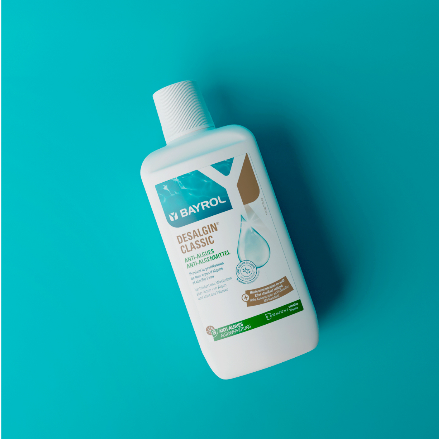 Raccomandazioni: La filtrazione deve funzionare tutti i giorni (almeno per un numero di ore pari alla metà della temperatura dell’acqua). Con caldo intenso o uso frequente della piscina, potrebbe essere necessario aumentare il dosaggio. Utilizzare Desalgin® CLASSIC tutta la stagione, anche senza presenza di alghe, come trattamento preventivo. In caso di alghe già presenti, eseguire sempre una clorazione shock con Desalgin® SHOCK o un altro prodotto shock BAYROL.