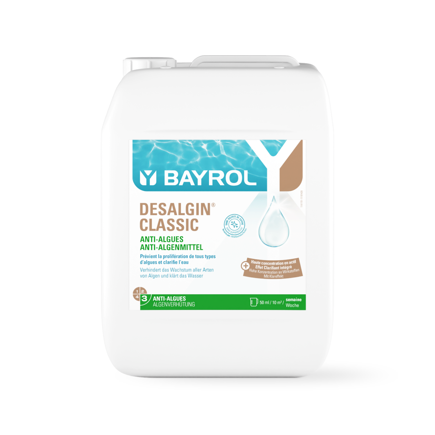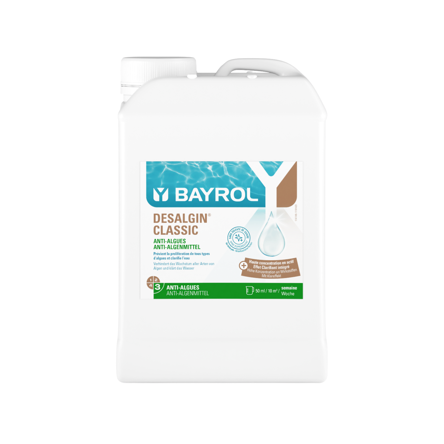Desalgin® CLASSIC è un anti-alghe concentrato a basso potere schiumogeno e pH neutro. Usato regolarmente, impedisce la proliferazione delle alghe e contribuisce a rendere l’acqua più limpida grazie alla sua sostanza attiva chiarificante.