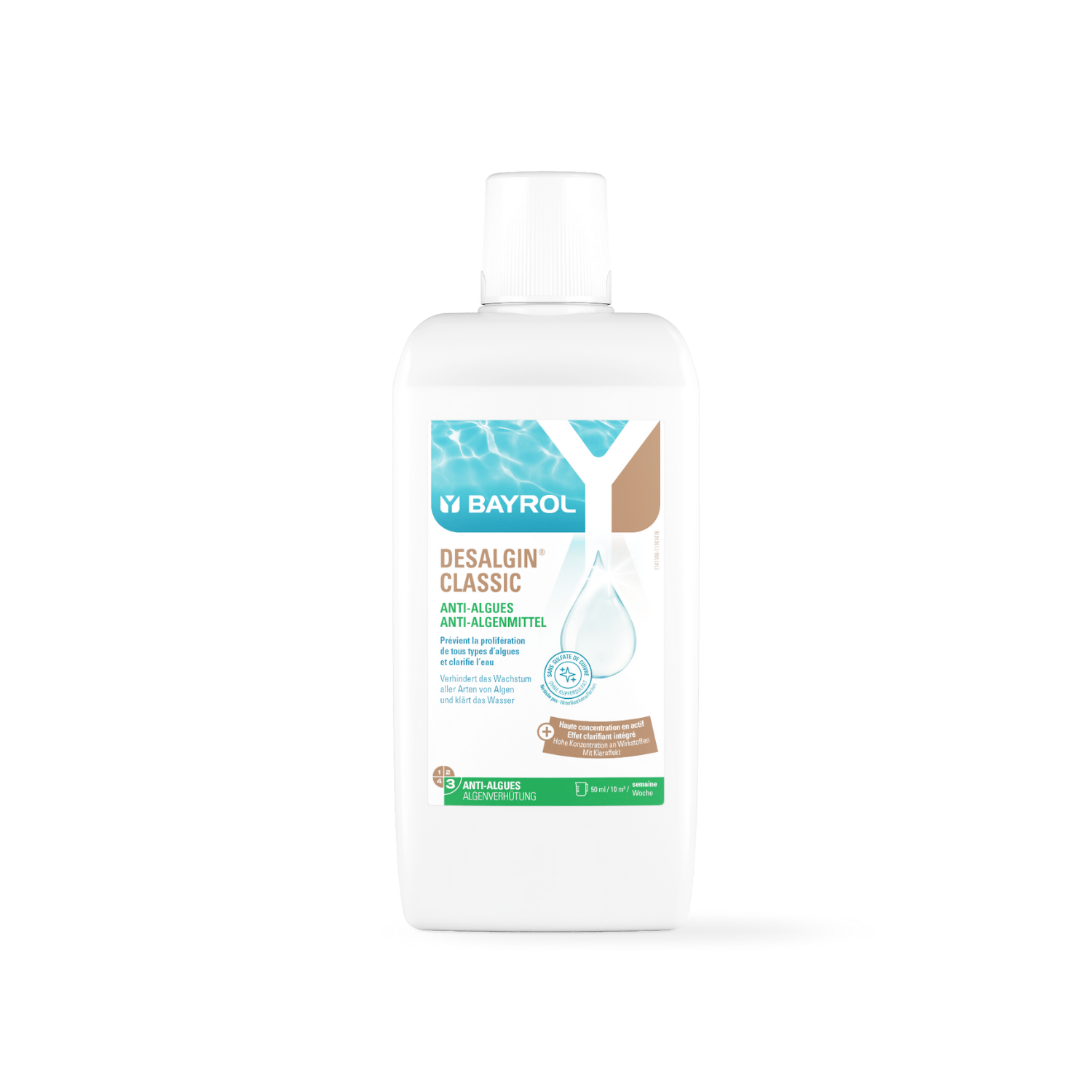 Desalgin® CLASSIC est un traitement anti-algues concentré pour un traitement hebdomadaire préventif. Il empêche le développement et la prolifération des algues. Agit sur une grande variété d'algues. Desalgin® CLASSIC rend l'eau plus transparente.