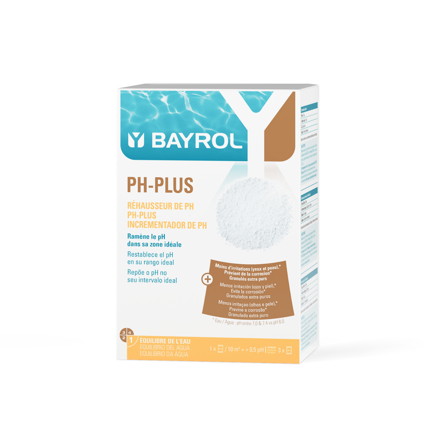 pH-Plus agisce in modo efficace sui pH troppo bassi. Consente di aumentare rapidamente il valore del pH per riportarlo tra 7,0 e 7,4. pH-Plus è compatibile con tutti i metodi di trattamento (bromo, ossigeno attivo, cloro, PHMB, …), con tutti i sistemi di filtrazione (diatomee, cartucce, sabbia, vetro…) e con tutti i rivestimenti (liner, piastrelle, silico-marmo, poliestere).